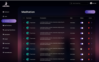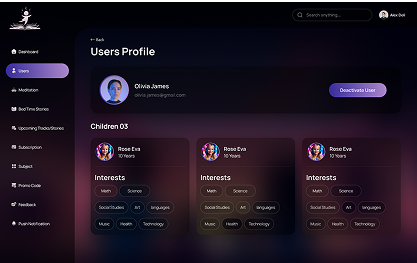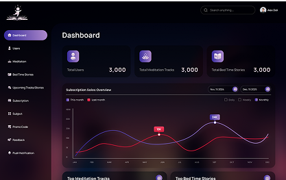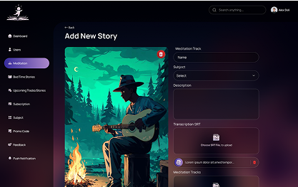 The Admin Dashboard serves as the central control system for managing all content within Harmonious Learning. It streamlines the organization of tracks, stories, categories, and community uploads through an intuitive moderation flow with clear approve or reject actions. Admins can monitor user interactions, track engagement metrics, and generate detailed reports on content performance, listening patterns, and overall site activity trends. A dedicated feedback center allows admins to review parent suggestions and identify improvement opportunities. With a clean, efficient UI, the dashboard supports quick decision-making and ensures the platform remains safe, organized, and engaging for young users and their families.